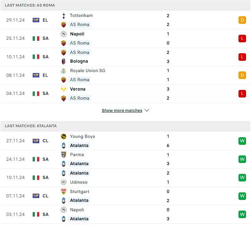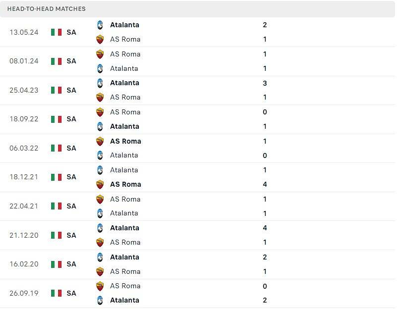 Trong 5 trận gần nhất, Atalanta bất bại trước Roma với 2 chiến thắng, 3 trận hòa.